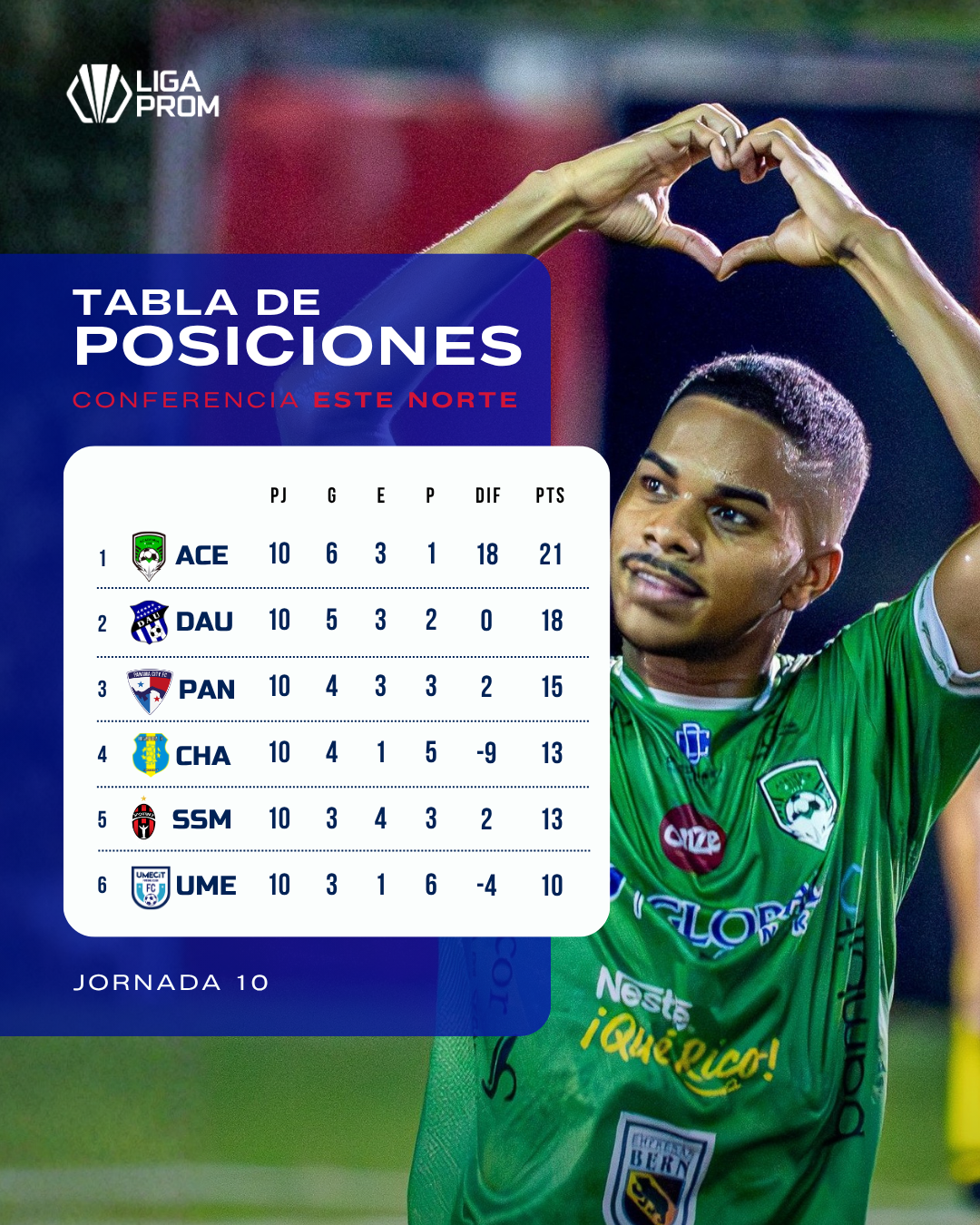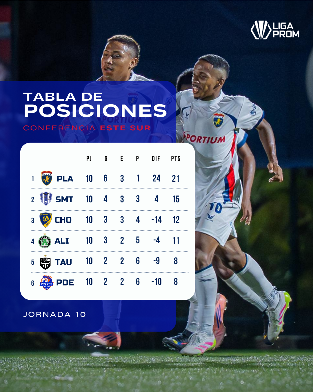 Como es habitual, arrancamos con los punteros de la conferencia este, en donde ambas zonas están muy apretadas y nadie quiere cometer un error para dejar puntos. En la zona norte de la conferencia tenemos a la Academia Costa del Este, quien lidera la tabla con 21 puntos. El Árabe Unido de Colón se mantiene en el segundo puesto con 18 puntos y con la victoria importantísima de Panamá City en la fecha 10 sobre el Plaza Amador, el combinado ‘citizen’ se mete en la pelea en el tercer puesto con 15 puntos.