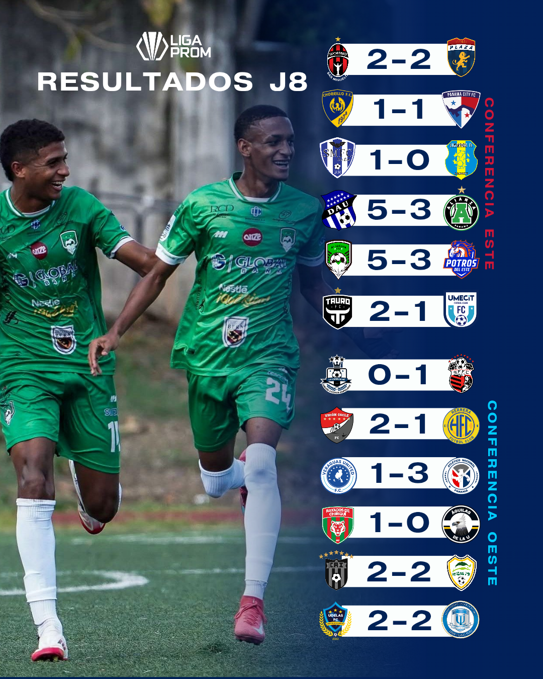 El equipo de la policía, Atlético Nacional, volvió a sumar de a tres puntos, luego de ganarle a Veraguas United por 3 goles a 1 en el estadio ‘Toco’ Castillo. Y para finalizar la jornada 8 de Liga PROM, los últimos dos encuentros concluyeron con empates a 2 goles: CAI y Bocas FC igualaron en el ‘Muquita’ Sánchez y Udelas FC junto con Universidad Latina FC en el Javier Cruz.